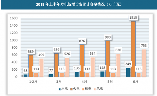 2018年上半年,火电累计新增发电装机容量为1515万千瓦,水电为249万千瓦,风电为753万千瓦,核电为113万千瓦。