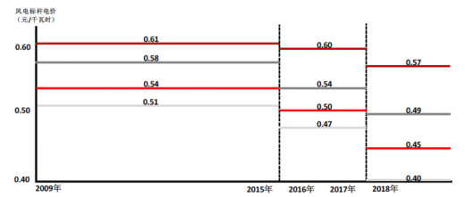 发改委多次调整陆上风电标杆电价。 2015 年 12 月,发改委发布《调整陆上风电光伏发电上网标杆电价政策》,对陆上风电标杆电价进行调整。2016 年 12 月,发改委再次 2018 年陆上风电项目标杆电价进行调整,四类资源区分别为 0.40、0.45、0.49、0.57 元/kwh。
