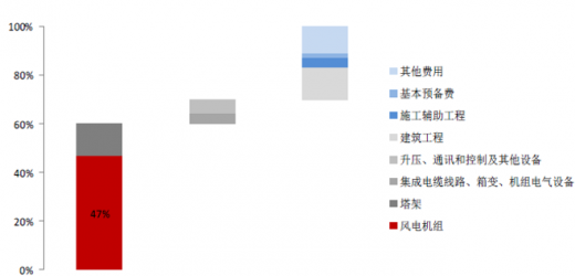 2009-2016 年期间陆上风电装机单位成本下降了 65%,目前风机成本占总成本约为 47%。