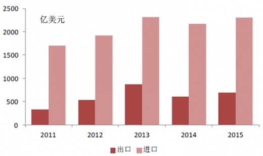 全球半导体市场在2014 年9.9%的高速增长后,2015 年全球半导体市场出现下滑, 2015 年全球半导体市场销售额3352 亿美元,同比下降了0.2%。全球半导体市场下滑的主要原因是pc 销售下降和智能增速放缓,根据idc 统计2015 年全球pc 出货量同比下降10.3%。全球市场研究机构trendforce 最新报告显示,2015 年全球智能手机出货量为12.93 亿部,年增长10.3%,低于2014 年15.6 个百分点。受到需求不足影响的2015 年日本和欧洲半导体市场出现了下降的情况。