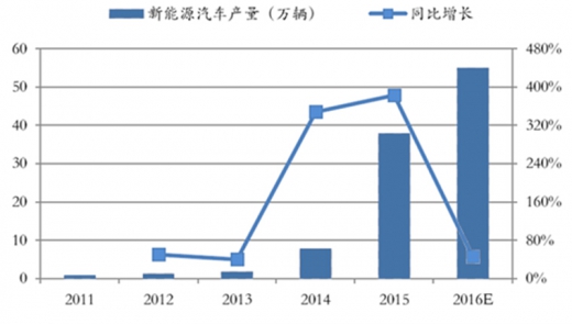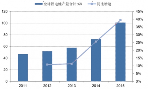 近年来,我国新能源汽车中使用锂离子电池比例不断升高,锂电池市场空间广阔。按照新能源汽车发展规划路线,2015年国内纯电动汽车销量达到50万辆,混合动力占全部汽车销量的30%;2020年,纯电动汽车将突破500万辆,以混合动力为代表的节能汽车达到全部汽车销量的75%。