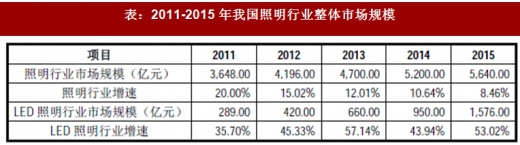2015 年,全球经济出现了下滑的情况,我国整体经济形势增速逐渐放缓,在整体大环境的影响下,进出口贸易受到很大影响,许多行业的出口不增反降,但是我国照明行业依旧保持平稳的增长。2015 年,照明行业总体市场规模达到5640亿元,增速达8.5%;此外,led 照明发展迅速,技术革新快,整体市场表现强势,在国内和国际的市场份额也逐步上升,2015 年,我国led 照明市场规模达到1576亿元,增速维持在50%以上。