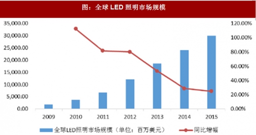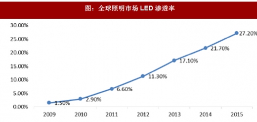 伴随研发投入的持续增长,led 光源产品技术逐步走向成熟,行业成本控制能力显著提升。目前,各国纷纷推动绿色、节能灯具的应用,全球led 照明市场规模呈现高速增长的发展态势,市场渗透率显著提升。根据数据,2009 年,全球led 照明市场规模17.50 亿美元,市场渗透率仅为1.50%;2010 年市场规模增至37.17 亿美元,较上年增幅112.40%;2012 年全球市场规模一举突破百亿美元大关,达到121.48 亿美元,市场渗透率达11.30%;2015 年,全球led 照明市场规模接近300 亿美元,2009 年至2015 年年均复合增长率为60.49%,市场渗透率达到27.2%。