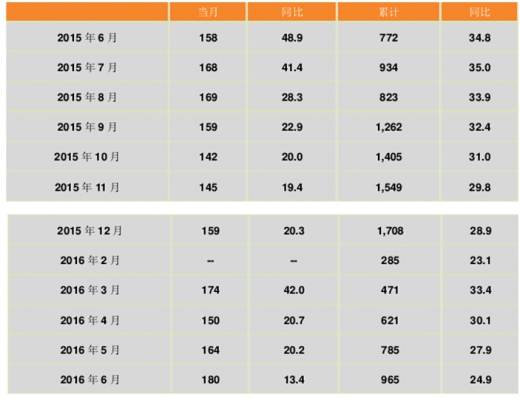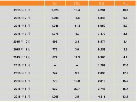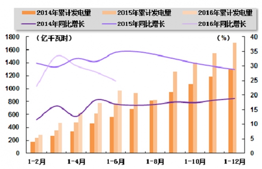 核电和其他新能源生产方面,2016 年 2 季度,核电发电量增速虽有所回落,但与其他类型电源发电量相比仍处于较高水平。国家统计局发布的数据显示,2016 年上半年,核电累计发电量 965 亿千瓦时,同比增长 24.9%,增速与 2016 年 1 季度相比回落 8.5 个百分点,与上年同期相比回落9.9个百分点。其中,6月份,核电发电量180亿千瓦时,同比增长13.4%,增速与 5 月份相比回落 6.8 个百分点,与上年同期相比回落 35.5 个百分点。 另外,风电发电量仍保持快速增长,但增速较上年同期有所放缓。国家统计局发布的数据显示,2016 年上半年,风电累计完成发电量 1,232 亿千瓦时,同比增长 24.4%,增速与2016 年 1 季度相比提高 3.3 个百分点,与上年同期相比回落 1.8 个百分点;其中,6 月份,风电发电量 174 亿千瓦时,同比增长 15.4%,增速环比回落 21.5 个百分点,与上年同期相比回落 34.5 个百分点。 2015 年 6 月-2016 年 6 月核电发电量及同比增长情况