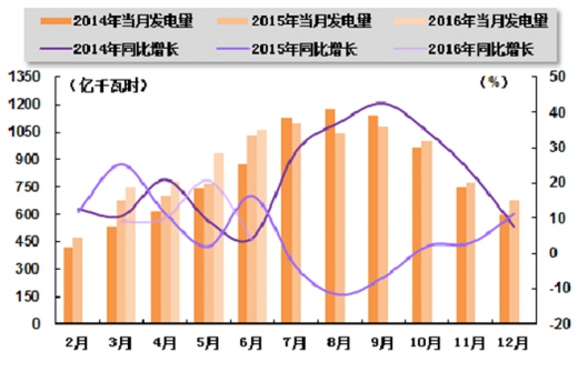 水电生产方面,2016 年 2 季度,受超强厄尔尼诺现象影响,主要流域来水较常年偏多,水电发电量保持较高水平。国家统计局发布的数据显示,2016 年上半年,水电累计发电量4,811 亿千瓦时,同比增长 13.4%,增速与 2016 年 1 季度相比回落 4.1 个百分点,与上年同期相比提高 0.1 个百分点。其中,6 月份,全国水电发电量完成 1,065 亿千瓦时,同比增长3.5%,增速环比回落 17.2 个百分点,与上年同期相比回落 12.9 个百分点。 2015 年 6 月-2016 年 6 月水电发电量及同比增长情况