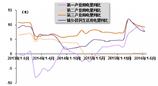 从各产业用电情况来看,2016 年 2 季度,随着国家产业结构调整和转型升级效果继续显现,我国电力消费增长动力持续转换,用电结构继续优化。其中,第三产业和城乡居民生活用电量继续快速增长,为带动全社会用电量增速回升的主要动力,占全社会用电量的比重同比均继续提高;而因高耗能行业用电量降幅较大,第二产业用电总体仍较低迷,用电量占比同比继续回落;此外,第一产业用电量增速也实现较快增长,但占全社会用电量的比重依旧较小。 国家能源局发布的数据显示,2016 年上半年,第一产业用电量 475 亿千瓦时,同比增长 7.7%,增速与上年同期相比提高 6.8 个百分点。第二产业用电量 19,579 亿千瓦时,同比增长 0.5%,上年同期为同比下降 0.5%。第三产业用电量 3,709 亿千瓦时,同比增长 9.2%,增速与上年同期相比提高 1.1 个百分点。城乡居民生活用电量 3,816 亿千瓦时,同比增长7.7%,增速与上年同期相比提高 2.9 个百分点。第一、第二、第三产业、城乡居民生活累计用电量分别占全社会用电量的比重为 1.7%、71.2%、13.4%、13.7%,与上年同期相比,第二产业占比下降1.1个百分点,第一产业、第三产业和城乡居民生活用电量占比分别提高0.1、0.6 和 0.4 个百分点。