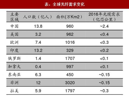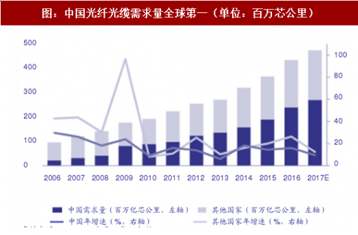 2017年,全球预计光纤需求为4.89亿芯公里(同比 8.1%),而中国光纤规划需求量约为2.70亿芯公里(同比12.5% ),占比全球总需求比重提升至55%。 仅国内光纤光缆最大需求运营商—— 中国移动一家公司的光缆安装量就已超过北美、西非、东欧以及中东地区所有网络运营商的安装总量。