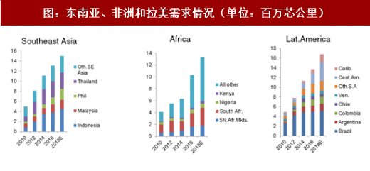 东南亚、非洲和拉丁美洲,三个地区总计包括100多个国家,其中只有12个国家拥有自己的光缆制造厂,大部分国家均为光纤光缆纯进口国。其2014年光缆需求总量仅为3000万纤芯公里,相当于中国2014年需求总量的20%。 按照下图对2018年需求量的预测,这三个区域仍具备较强的增长潜力,5年复合增长率超过10%。