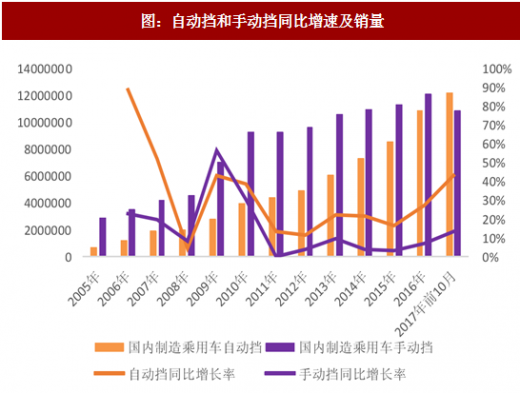 自动挡销量增速约二倍多余手动挡乘用车销量增速。自动挡随着成本下降,目前已经是各种爆款车的主流配置,而手动挡因为操作复杂,份额逐年下滑。2017 年自动挡车首次超越手动挡车成为主流,我们认为未来自动挡的渗透率仍有进一步提升的空间。对比美国的 80%,我国目前新车中只有 50%左右是自动挡,未来自动挡仍将超越行业增速增长。