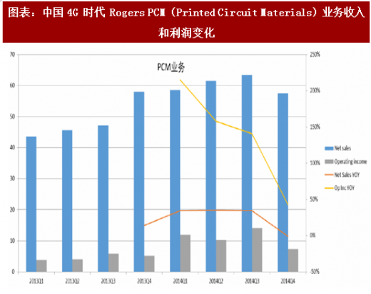 从 2013 年底中国发布 td-lte 4g 牌照后,rogers 作为高频 ccl 龙头,便迎来了 pcm 业务收入和利润的大幅增长。