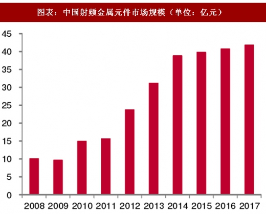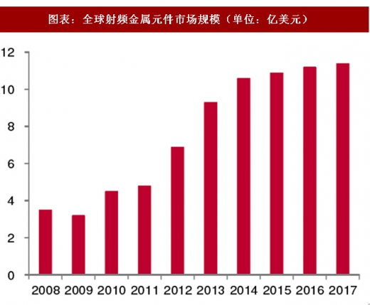 在 4g 基站投资的带动下,近年来射频器件的市场规模呈上涨之势,国内目前每年射频金属元件的市场规模在40亿元左右。根据我们产业调研结果,目前单个基站所需的射频器件价格约为500~1500元之间。因为5g所用频谱的频率升高,器件制造难度提升,因此我们预计射频器件价格会较目前有一定上升。此外,基站组网密度的提升、massive mimo的应用都会使得所需射频器件数目上升,市场规模会有较大幅度增长。根据我们之前的预测,5g射频器件的整体市场规模有望超过300亿元。