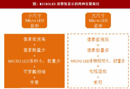 苹果瞄准的则是以手表、手机为代表的中小尺寸显示,其运用到的技术正是microled技术,即led的微缩化与矩阵化技术。为了使led显示屏在手机、手表上也保持较高的分辨率,microled灯珠间距需要远小于小间距屏:microled灯珠间距在1-100μm,其间距是当今最先进的p0.7小间距显示的1/700-1/7!microled采用的技术手段也与传统的小间距led完全不同,摒弃了传统的led芯片封装->贴合基板->显示的形式,采用芯片“无封装”结构,通过转移技术将裸芯片直接连接于基板上。microled概念最早由初创公司luxvue提出,苹果于2014年5月收购luxvue,并于2015年4月于台湾龙潭设厂研发,完成对microled的技术储备。