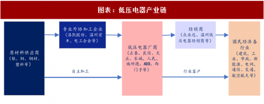 低压电器行业的上游为原材料,下游为最终用户。低压电器产业链上游主要为、、钢材、塑料等原材料供应企业及专业化的零部件加工行业,如电接触触头、外壳等。低压电器厂商自主加工零部件或者通过专业厂商采购,制成产品后通过经销商渠道或者直销渠道,将产品销售给下游客户。低压电器产品被广泛应用于国民经济的各个行业,比较典型的有建筑、工业、新能源、通信、电力等行业。