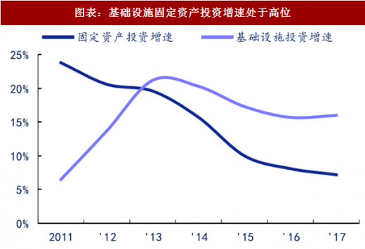 根据国家统计局数据,2017 年 1-11 月累计,全国一般公共预算收入 161748 亿元,同比增长 8.4%。其中,中央一般公共预算收入 77,390 亿元,同比增长 8.1%;地方一般公共预算本级收入 84,358 亿元,同比增长 8.7%。但“补短板”的几个子行业增速依旧较高,预计未来基础建设固定资产投资增速还将维持相对高位。