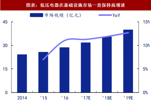 项目型市场中,低压电器在基础设施板块的市场约 30 亿,2015-2016 年在该领域的需求增长分别为 7%和 11%。考虑到基础设施投资在未来几年仍有望保持在较高增速,我们判断低压电器在该领域的增速有望保持在 11%以上并逐年略增。