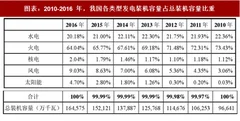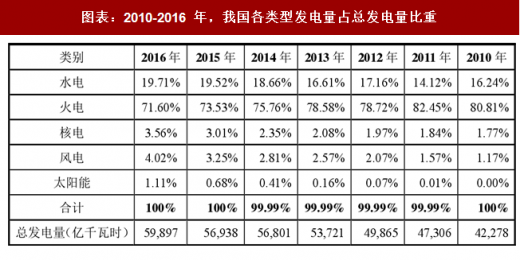 2016 年全国全口径发电量 59,897 亿千瓦时,同比增长 5.2%。其中,水电11,807 亿千瓦时,同比增长 6.2%,占全国发电量的 19.7%,比上年增加 0.2 个百分点;火电 42,886 亿千瓦时,同比增长 2.4%,占全国发电量的 71.6%,比上年降低 1.9 个百分点;核电、并网风电和并网发电量分别是 2,132 亿千瓦时、2,410 亿千瓦时和 662 亿千瓦时,同比分别增长 24.4%、30.1%和 71.9%,占全国发电量的比重分别比上年提高 0.55、0.77 和 0.43 个百分点。