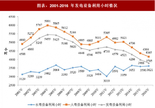 据中国电力企业联合会《2016 年电力工业统计快报》统计,全国 6,000 千瓦及以上电厂发电设备平均利用小时继续下降,2016 年全国发电设备平均利用小时为 3,785 小时,同比降低 203 小时,是 1964 年以来的 低水平。其中火电设备利用小时 4,165 小时,同比下降 199 小时;并网风电平均利用小时 1,742 小时,同比增加 18 小时,但西北、东北等地区弃风情况仍然突出;并网太阳能发电设备利用小时 1,125 小时,同比下降 99 小时,降幅比上年扩大 88 小时,西北地区部分省份弃光情况较为突出。全国发电设备延续了近年来设备利用小时数逐年下滑的趋势。