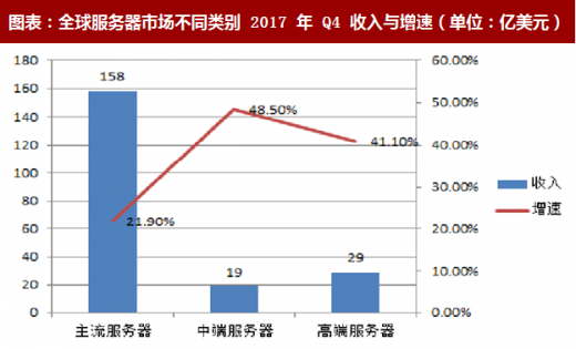 idc 报告显示,2017 年 q4 主流服务器收入增长 21.9%至 158 亿美元,而中端服务器收入增长 48.5%至 19 亿美元。高端系统在上个季度 ibm 推出 z14 的推动下,增长了 41.1%,达到 29 亿美元。