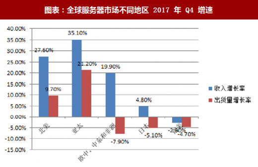 从地域来看,北美和亚太地区的收入呈现双位数增长,增幅分别为 27.6%和 35.1%。出货量方面,北美增长 9.7%,亚太增长 21.2%。欧洲、中东和非洲(emea)地区同比大幅增长 19.9%,而出货量下降 7.9%。日本收入增长 4.8%,但出货量下降 5.1%。拉丁美洲是 2017 年第四季度唯一一个出货量和收入都下降的地区,降幅分别为 4.7%和 2.9%。这两个地区是全球互联网产业最发达的地区。