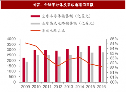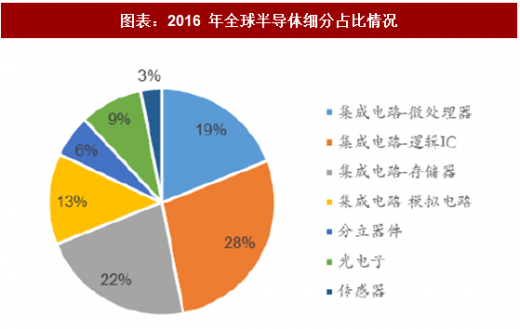 根据世界半导体贸易协会(wsts)统计,2016年全球半导体市场规模同比增长1.1%达3389亿美元,其中集成电路市场规模为2767亿美元,占比达81.6%。进一步看细分占比情况,微处理器、逻辑芯片、存储器、模拟电路市场规模分别占半导体市场的19%、28%、22%、13%。