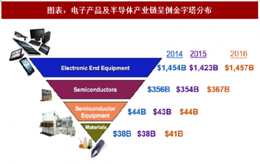从产值分布来看,电子设备及半导体产业产值呈倒金字塔分布,由下游电子产品→半导体器件芯片→半设备→材料,产值越来越小,技术难度及行业壁垒越来越大。