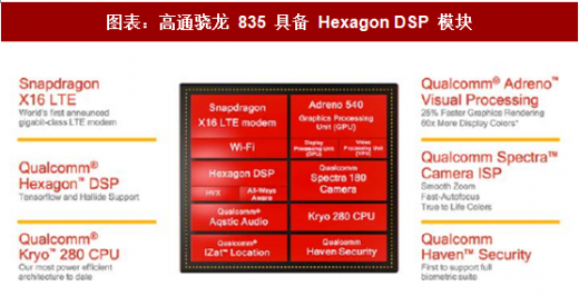 我们认为“soc ip”模式有望成为主流。当深度神经网络加速功能做成 ip 时,它就成为 soc 的一个模块,当 soc 需要做深度学习相关运算时就交给该模块去做。因此对于深度学习加速领域的企业,能够更为灵活、更小投入地对深度学习加速产品进行开发和升级。近期发布的高通骁龙 835 与海思麒麟 970 均采用了这一模式。