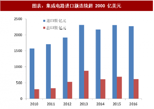 2016年,中国集成电路进口额高达2271亿美元,连续4年进口额超过2000亿美元。同时集成电路出口金额为613.8亿美元,贸易逆差达 1657 亿美元。集成电路进口总额已超过同期原油进口额,成为我国第一大进口商品。
