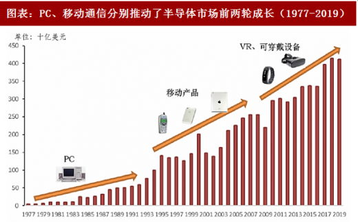 下游需求始终是推动半导体产业进步的动力源泉。从 1970 年代以来,伴随着电脑、手机和平板产品消费的持续增长,全球半导体行业实现了快速发展,全球半导体市场规模由最初的十亿美元规模增长至 2017 年的 4,087 亿美元。未来几年随着汽车电子、云计算、大数据、ai 等行业的兴起,预计半导体行业规模仍将持续增长。据世界半导体贸易统计组织(wsts)预计,到2018年全球半导体行业销售规模将达到4110亿美元。
