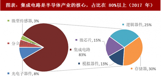 根据产品类型的差异,半导体元器件可分为、分立器件、和微型传感器等。根据wsts统计,2017年全球集成电路销售额高达3402亿美元,占半导体市场的83.33%,其中存储器、逻辑器件、微芯片和模拟器件分别占 30%、25%、15%和 13%。