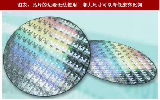 为了降低芯片成本,需要不断的提高生产的效率,一方面是提高产品的良率,另一方面是改进工艺,不断变大的晶圆尺寸就是发展趋势之一。芯片(chip)生产过程第一步是在圆形晶圆(wafer)上制造出一个个集成电路,再切割成一个个长方形晶片(die),在切割的过程中必须切掉边缘部分不完整的电路。因此晶片越大,容纳的电路越多,废弃的比例越少,同时也降低了成本,但其要求的材料技术和生产技术也更高。