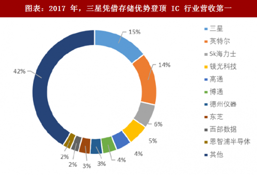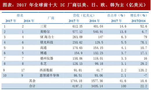 根据gartner统计,2017年世界前10大ic厂商销售额高达2453.02亿美元(未包括代工厂商),占全行业销售收入的58.44%。其中三星凭借612.15亿美元的销售收入登顶,英特尔以577.12亿美元收入居于次席,sk海力士以263.09亿美元收入位居第三。(不同机构统计数据略有差异)