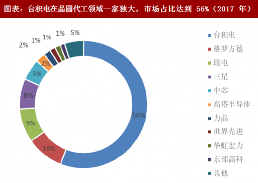 台积电以330亿美元收入占据代工市场56%左右的份额。根据拓墣产业研究院预计,2017年全球晶圆代工总产值约为573亿美元,整体增长7.1%。大陆企业中芯国际以30.99亿美元收入位居代工企业第四,华虹宏力以8.07亿美元收入位居第九。