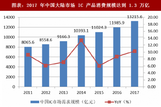 2017年我国ic市场消费规模超过1.3万亿。近几年随着国内电子行业的崛起,智能手机、平板电脑、汽车电子、工业控制、仪器仪表以及智能家居等物联网市场快速发展,已在全球市场占据领先地位,同时对各类ic产品需求不断增长。2000年我国 ic市场消费规模仅为 945 亿元人民币,到2017年已增长至13,215.6亿元人民币。2017年中国ic市场消费规模占全球市场的61%,并保持10%以上的增速。