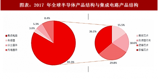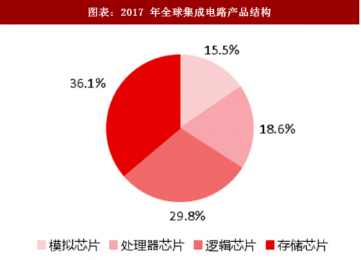 进一步细分,集成电路包括逻辑芯片、存储芯片、处理器芯片和模拟芯片四种。根据 wsts 的数据,2017 年的这四类集成电路芯片的市场规模分别为 1022 亿美元、1240 亿美元、