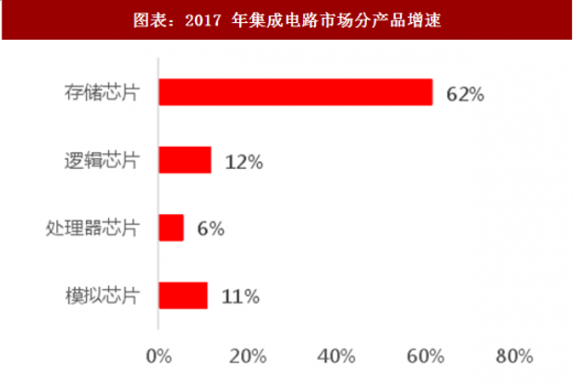 wsts 预计 2018 年存储器芯片市场的规模将增长 11.6%,模拟芯片和逻辑芯片的市场规模也将分别增长 8.1%和 9.3%,处理器芯片的市场规模将增长 7.1%。 在 2018 年,存储