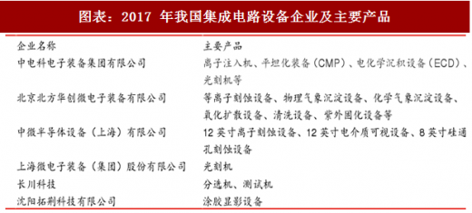 根据中国半导体协会的统计,2017 年国内集成电路设备排名前五的企业分别为中电科电子装备集团有限公司、北京北方华创微电子装备有限公司、中微半导体设备(上海)有限公司、上海微电子装备(集团)股份有限公司、长川科技和沈阳拓荆科技有限公司,其主要产品如下表所示: