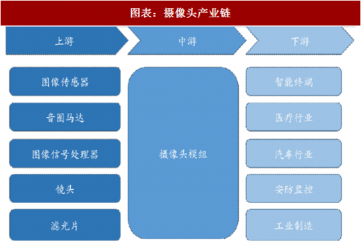 摄像头产业链上游零部件主要有镜头、微型马达、电路板、图像传感器、图像信号处理器、滤光片、支架等。中游是摄像头模组的制造。下游是智能手机、平板电脑、笔记本电脑、pc、视频会议、视频监控、车载、工业、娱乐、医疗等应用领域。