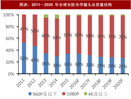 tsr 预计安防镜头中变焦镜头的出货量占比将从 2015 年的 25%不断上升,2020 年占比将达到 38%,其中 3 倍变焦镜头出货量占比将由 2015 年的 20%提升至 2020 年的 30%。镜头的分辨率也将不断提升。1080p 的安防镜头出货量占比将由 2015 年的 65% 提高至 2020 年的 72%。