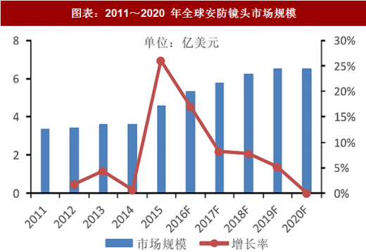 tsr 预计 2016 年全球安防镜头市场规模为 5.33 亿美元,同增长 17%。2017 年将达到 5.77 亿美元,同比增长 8%。2020 年将达到 6.53 亿美元。