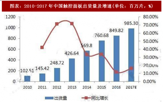 2010-2016年中国触控面板出货量表现为快速增长态势,前六年间年均增长率处于较高水平,反映出中国触摸屏显示器行业发展迅速。2015年,中国触控面板出货量为760.68百万片,同比增长33%。2016年,中国触控面板出货量为849.82百万片,同比增长12%。