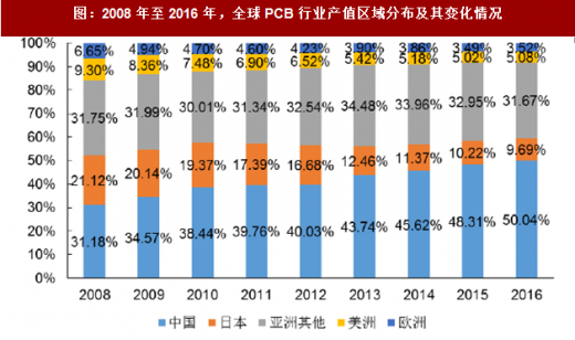 2008 年至2016 年,美洲、欧洲和日本pcb 产值在全球的占比不断下降,分别由2008 年的9.30%、6.65%和21.12%降至2016 年的5.08%、3.52%和9.69%;与此同时,中国大陆pcb 产值全球占有率则不断攀升,由2008 年的31.18%进一步增加至2016 年的50.04%;除中国大陆和日本外的亚洲其他地区pcb 产值全球占有率亦缓慢上升。全球pcb 行业产能(尤其是高多层板、挠性板、封装基板等高技术含量pcb)进一步向中国大陆等亚洲地区集中。