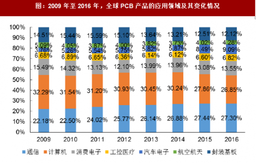 在下游应用领域方面,通信、计算机和消费电子等已成为pcb 三大应用领域,2016 年该三大领域合计占pcb 总需求的比重为67.70%。2009 年至2016年,通信和汽车电子领域的pcb 需求占比由22.18%和3.76%分别提升至27.30%和9.09%,成为pcb 应用增长最为快速的领域,主要得益于移动互联网终端产品的蓬勃发展以及汽车电子的广泛应用。随着电子信息产业的持续发展,未来pcb 的应用将进一步深化和延伸。