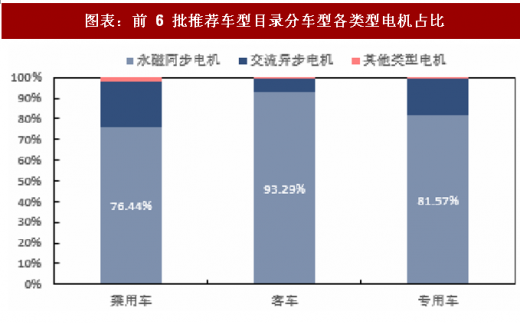 永磁同步电机性能优越,且我国稀土资源储量充足,成为当前电机市场的主流。今年前六批《新能源汽车推广应用推荐车型目录》数据显示,所有上公告新能源汽车车型中,搭载永磁同步电机的车型占比达到 88.30%;分车型来看,应用占比最低的乘用车也超过 75%。此外,特斯拉下半年量产车 model 3 将电机类型从交流异步电机改为永磁同步电机,进一步证明永磁路线是当前市场主流。