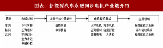 新能源汽车用永磁同步电机产业链上游为、铜材及稀土永磁材料等原材料,之后为定子和转子等核心零部件,由于定转子的加工质量很大程度上决定了电机产品的性能,目前多数电机整机企业仍采用自制定转子的方式,未来随着第三方企业加工质量的提高,产业分工有望细化。中游为电机整机集成商,下游应用领域为各类新能源汽车车型。