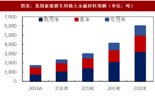 拉动稀土永磁材料广阔需求。目前,包含驱动电机在内,单台新能源乘用车和专用车稀土永磁材料用量约 2.5kg,单台客车用量约 6kg,我们以此进行预测,到 2020 年新能源汽车用稀土永磁材料将达 6039 吨,我国年产稀土永磁材料 10 万吨左右,则新能源汽车用永磁材料占比将达 6%左右。
