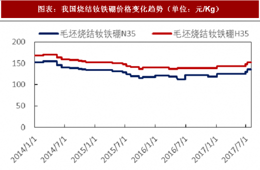 稀土打黑减小永磁稀土材料供给。钕铁硼又称磁钢,其组成成分中,稀土元素钕占比约 30%,金属元素铁占比约 65%,非金属元素硼占比约 1%,钕元素含量占比虽不如铁,但其成本占比高,决定了钕铁硼价格受稀土材料影响较大。2016 年底,工信部组织八部门开展稀土打黑行动,意在打击违规开采行为、控制稀土产量,相比于历次打黑,本次持续时间长、力度大,行业普遍预期打黑将常态化,一方面规范了稀土市场,同时也使得稀土材料供应减少,价格上涨。