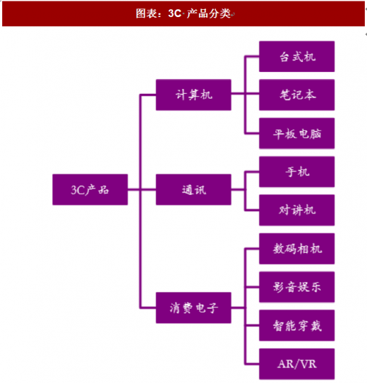 3c 产品即计算机(computer)、通讯(communication)、消费电子(consumer electric)的统称。其中计算机主要指电脑,具体又可以细 分为台式机、笔记本和平板电脑;通讯产品包括手机和对讲机;消费电子种类繁多,如、娱乐设备等。