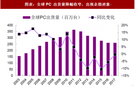 图表:全球pc 出货量降幅收窄,出现企稳迹象