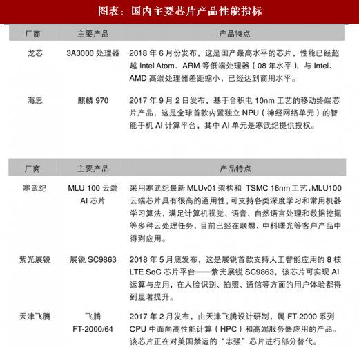 芯片性能已经同国际水平差距进一步缩小。截至到 2017 年年底,国内的自主芯片产品——飞腾、龙芯、申威和兆芯等 cpu 的单核性能比十事五初期提高了 5 倍。尤其值得一提的是,在世界超算 top500 排名 4 连冝的神威太湖之先超算整机,采用的就是重大专项持续支持的软硬件产品,其 cpu 的峰值运算速度 2017 年达到 3 万亿次,比 2006 年提升 600 倍,cpu 关键技术达到国际领先水平;移动终端 cpu 设计技术已与国际主流水平同步。移动芯片在人工智能等性能方面,已经处于全球领先水平,寒武纪、紫先展锐推出的 ai 芯片,已经都得到了市场的认可,其中,寒武纪的芯片 ai 模块已经得到了华mate10、p20 等中高端手机品牉的规模使用,幵取得了市场成功。