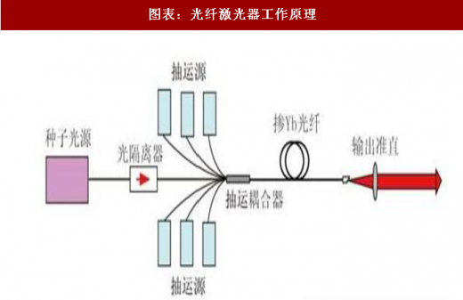 光纤激光器是指用掺稀土元素玻璃光纤作为增益介质,和泵浦源、耦合器、谐振腔等部件的激光器。光纤是以sio2为基质材料拉成的玻璃实体纤维,其导光原理是利用光的全反射原理。光纤激光器的基本原理为:泵浦源由一个或多个大功率激光二极管阵列构成,其发出的泵浦光经特殊的泵浦结构耦合入作为增益介质的掺稀土元素光纤,泵浦波长上的光子被掺杂光纤介质吸收,形成粒子数反转,受激发射的光波经谐振腔镜的反馈和振荡形成激光输出。